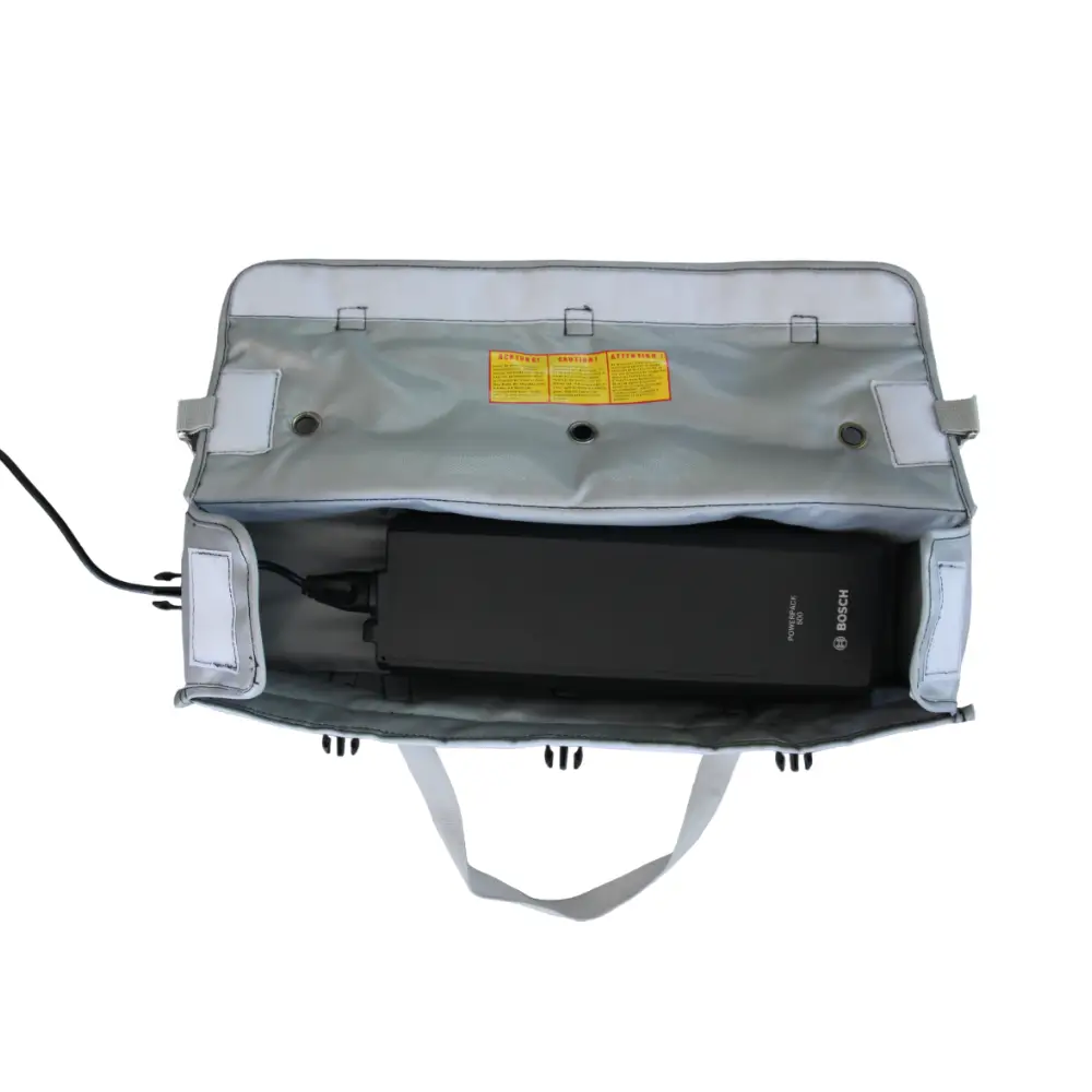 La sacoche batterie pour vélo électrique VLITEX ou une couverture de confinement incendie VLITEX offrent une protection supplémentaire. Toutes deux sont fabriquées en tissu de fibre de verre enduit de silicone, capable de résister brièvement à des températures allant jusqu’à 1 000 °C.